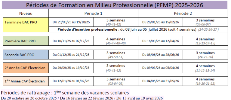 Mis à jour : janvier 2026Stages - Périodes de Formation en Milieu Professionnel 2025-2026 Document téléchargeable : Périodes des PFMP -